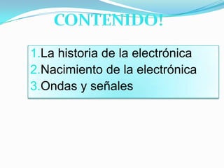 La electrónica surgió del descubrimiento accidental de Edison de que los electrones fluían de un filamento caliente a otro cargado positivamente. Esto llevó al desarrollo de aparatos como la radio, la televisión y las computadoras. La electrónica estudia las ondas y señales eléctricas, como las ondas de electrones que se comportan de manera similar a las ondas en el agua. El diodo, un dispositivo semiconductor clave, solo permite el paso de corriente en una dirección y funciona como un interruptor.