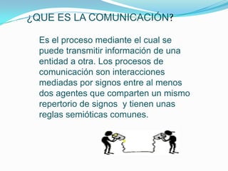 La comunicación es el proceso mediante el cual se transmite información entre al menos dos entidades a través de signos compartidos. Implica un emisor que codifica y envía un mensaje a través de un canal, un receptor que lo decodifica, y un código compartido. Los factores clave de la comunicación son el emisor, receptor, mensaje, canal y código.