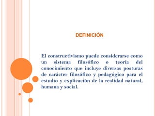 El documento presenta una definición del constructivismo como un sistema filosófico que incluye diversas posturas para explicar la realidad natural, humana y social. Explica tres posturas constructivistas: la radical basada en la construcción individual de la realidad, la piagetana donde el sujeto asimila el objeto de conocimiento y la social donde la persona construye sus aspectos cognitivos, sociales y afectivos. Finalmente, destaca las implicaciones del constructivismo en la educación, como partir del estado inicial del alumno, sus conocimientos previos y esquemas para constru