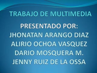 Este documento describe la multimedia como la integración de diferentes medios como texto, imágenes, sonido y video para presentar información de manera interactiva. Explica que la multimedia se utiliza ampliamente en educación, entretenimiento, negocios y lugares públicos para enriquecer la experiencia del usuario y transmitir información de manera más efectiva. También menciona que la realidad virtual es un campo emergente dentro de la multimedia que requiere grandes recursos computacionales para crear mundos tridimensionales realistas.