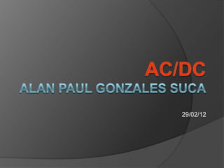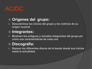 Este documento proporciona información sobre la banda de hard rock australiana AC/DC. Explica sus orígenes en 1973 en Sydney, Australia, fundada por los hermanos Malcolm y Angus Young. Detalla los miembros actuales y anteriores y sus características. Finalmente, resume su extensa discografía desde 1975 hasta el presente, incluyendo álbumes emblemáticos como Back in Black y Highway to Hell.
