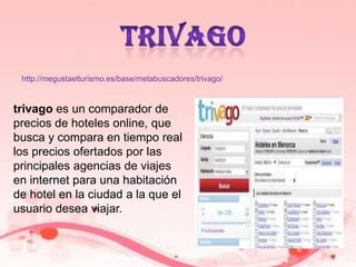 Trivago es un comparador de precios de hoteles que busca y compara en tiempo real los precios ofertados por agencias de viajes para una habitación. Travelzoo publica ofertas de más de 1,000 anunciantes de todo el mundo después de analizar cada oferta para encontrar las mejores condiciones. Turispain ayuda a planificar vacaciones con acceso a alojamientos, restaurantes, rutas y tiempo en España y promueve el turismo español.