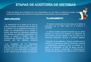 El documento describe las 5 etapas de una auditoría de sistemas: planeamiento, exploración, ejecución, supervisión e informe. También describe diferentes tipos de auditoría como auditoría externa, interna, fiscal, financiera, de gestión, especial, contable y la importancia de planear adecuadamente una auditoría de sistemas.
