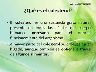 El colesterol es una sustancia grasa natural presente en todas las células del cuerpo humano y necesaria para su funcionamiento normal. Se produce principalmente en el hígado y también se obtiene a través de algunos alimentos. Tiene importantes funciones estructurales y es un precursor de hormonas y sales biliares.