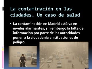 La contaminación en ciudades como Madrid está en niveles alarmantes y peligrosos para la salud, especialmente para personas vulnerables como asmáticos o alérgicos. A pesar de superar los límites legales de contaminación, las autoridades rara vez informan a los ciudadanos sobre los riesgos. La contaminación del aire causa más de dos millones de muertes al año a nivel mundial. Las principales fuentes son los vehículos de motor, aunque prohibirlos sería impopular. Las autoridades deberían proteger la salud pública informando a