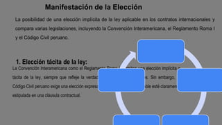 El documento analiza la necesidad urgente de adaptar las regulaciones sobre contratos internacionales en Perú, considerando que las normas actuales son obsoletas y no se ajustan al comercio globalizado. Se destaca la importancia de la autonomía conflictual y la falta de claridad en la ley aplicable a los contratos, así como la posibilidad de incorporar principios de soft law para modernizar el marco legal. También se identifican desafíos relacionados con la jurisdicción y el cumplimiento normativo que complican las relaciones contractuales internacionales.