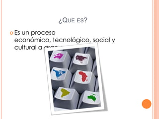 Este documento presenta una definición de globalización como un proceso económico, tecnológico, social y cultural a gran escala que implica una creciente comunicación e interdependencia entre países a través de transformaciones sociales, económicas y políticas. Identifica factores como el libre comercio, las fusiones de empresas multinacionales y la desregulación financiera como impulsores de la globalización, y señala posibles beneficios como una mayor eficiencia de mercado y desarrollo científico-técnico, así como ries