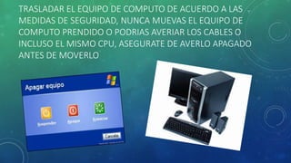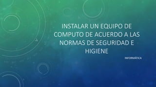 El documento detalla recomendaciones para instalar y mantener un equipo de cómputo siguiendo normas de seguridad e higiene informática. Se enfatiza la importancia de mover el equipo apagado, realizar conexiones correctas, y mantenerlo limpio y protegido de sobrecargas eléctricas. También se aconseja utilizar dispositivos de protección y evitar líquidos cerca del equipo para prevenir daños.