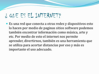 El documento explica qué es Internet, cómo buscar información en Internet de manera básica y avanzada, cómo encontrar resultados relevantes y precauciones al usar Internet. También concluye que Internet permite aprender y divertirse pero requiere un uso prudente para evitar fraudes o virus.