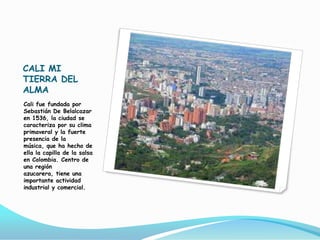 Cali fue fundada en 1536 por Sebastián De Belalcazar y se caracteriza por su clima cálido y por ser la cuna de la salsa en Colombia. El documento describe varios lugares turísticos de Cali como la estatua de su fundador, la Colonia de San Antonio y el Cerro de las Tres Cruces, que ofrecen vistas panorámicas de la ciudad. También menciona parques como el Acuaparque de la Caña y el zoológico, y destaca la gastronomía local como el manjar blanco y el sancocho. Por