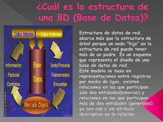 Este documento contiene información sobre bases de datos, tablas, consultas, formularios, informes, páginas, macros y módulos. Explica que una base de datos es un conjunto de datos almacenados sistemáticamente, mientras que un SGBD permite crear y mantener una base de datos. También describe las tablas, consultas, formularios e informes como elementos clave de una base de datos relacional.