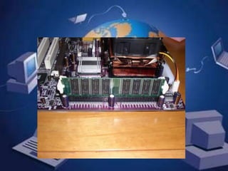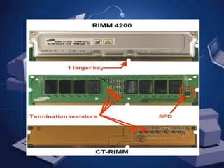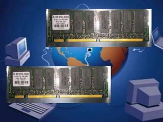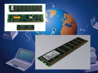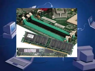 La memoria RAM es un tipo de memoria volátil que los ordenadores utilizan para almacenar temporalmente datos y programas durante su funcionamiento. Existen dos tipos principales de RAM: la dinámica (DRAM) y la estática (SRAM), que se diferencian en su tecnología de almacenamiento. La RAM es más rápida que otros tipos de almacenamiento como los discos duros, pero pierde su contenido al apagarse el equipo.