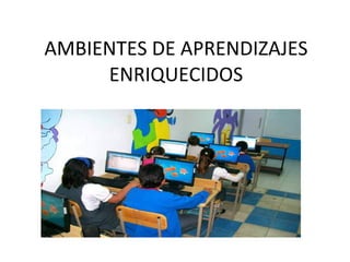 El documento habla sobre la creación de ambientes de aprendizaje enriquecidos mediante el uso de las TIC. Propone usar las TIC como herramienta para establecer relaciones de trabajo formativo en espacios adecuados que impulsen la creatividad de los estudiantes. Tiene como objetivos promover el desarrollo de competencias en TIC en la mayor cantidad posible de estudiantes e integrar las TIC en la enseñanza de las asignaturas básicas. Explica variables como la ubicación, cantidad y tipo de equipos que promueven