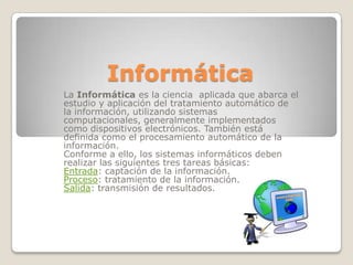 La informática educativa se refiere a la inserción de computadoras y el internet en los procesos de enseñanza y aprendizaje en todos los niveles educativos. La tecnología educativa utiliza las TIC para resolver problemas relacionados con la enseñanza y el aprendizaje. El uso de las TIC y la tecnología educativa en las escuelas ha enriquecido los escenarios educativos actuales y ha ayudado a desarrollar las competencias necesarias para enfrentar los desafíos de la globalización.