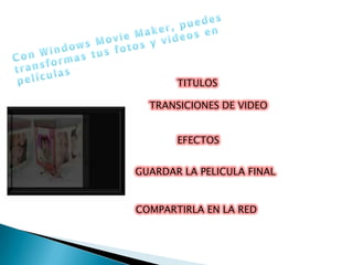 Este documento proporciona una introducción al programa Windows Movie Maker, incluyendo una descripción de sus principales características como barras de menús y herramientas, paneles, línea de tiempo y efectos visuales y de transición que permiten editar videos y agregar música y texto.