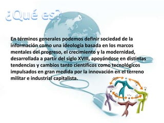 La sociedad de la información se define como una ideología que surge en el siglo XVIII, impulsada por avances científicos y tecnológicos, con el objetivo de asegurar el desarrollo equilibrado de todas las naciones. Jclic es una herramienta multimedia para la creación de actividades educativas interactivas, que permite a los educadores desarrollar y evaluar proyectos didácticos. Este software, evolucionado de Clic, funciona en diversos entornos y ofrece aplicaciones para crear y realizar actividades educativas, así como para gestionar informes de resultados.