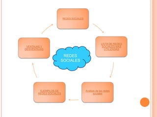 Este documento presenta una lista de las redes sociales más populares como Facebook, Twitter y Tuenti, y describe brevemente sus características y funcionalidades. También analiza las redes sociales desde una perspectiva teórica, estudiando su estructura y rol en las interacciones sociales. Finalmente, resume algunas ventajas como mantenerse en contacto con otros y compartir información, pero también señala posibles desventajas como la exposición de datos personales.