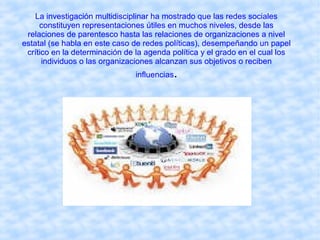 Una red social representa las relaciones entre individuos u organizaciones mediante un gráfico donde los nodos representan los elementos y las líneas representan las relaciones entre ellos, como amistad, parentesco o relaciones laborales. El análisis de redes sociales estudia esta estructura aplicando teoría de grafos e identificando las entidades como nodos y las relaciones como enlaces. Las redes sociales pueden medir el capital social de un individuo y también se refiere a plataformas en internet que facilitan la comunicación y relaciones sociales entre usuarios.