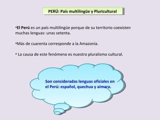 El documento describe el multilingüismo en Perú. Más de setenta lenguas se hablan en el territorio peruano, incluyendo el español, quechua y aimara que son oficiales. Antes de la llegada de los españoles, el proto-quechua, proto-aru y puquina eran las tres lenguas mayores. Ahora, las lenguas se dividen en dos grupos: las lenguas amerindias como el quechua y aimara, y las no amerindias como el español. El quechua es la lengua amerindia más hablada