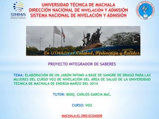 Este proyecto buscó elaborar un jabón íntimo a base de sangre de drago para las mujeres del curso VO2 de Nivelación de la Universidad Técnica de Machala, luego de evidenciar mediante encuestas que existían problemas de irritaciones vaginales. Se investigó sobre los beneficios de la sangre de drago y se formuló un jabón siguiendo un procedimiento con sustancias naturales. Las encuestas posteriores mostraron que el producto fue de agrado y no tuvo efectos secundarios.