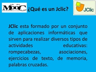 JClic es un conjunto de aplicaciones informáticas que sirven para crear y realizar diversas actividades educativas interactivas como rompecabezas, asociaciones y ejercicios. Está formado por JClic Player para ejecutar actividades, JClic Author para crear y editar actividades de forma sencilla e intuitiva, y JClic Reports que recopila datos sobre el desempeño de los estudiantes y genera informes estadísticos. JClic es una evolución del programa Clic que lleva más de 10 años siendo utilizado por educadores