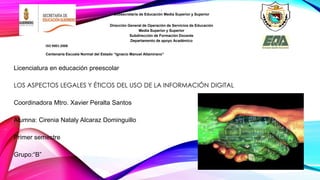 El documento habla sobre los aspectos legales y éticos del uso de la información digital. Explica que desde el punto de vista legal, las personas están sujetas a normas jurídicas establecidas por leyes y regulaciones. También discute la importancia de promover una cultura jurídica sobre tecnologías de la información y fortalecer las normas internas de las empresas de acuerdo a la ley. Finalmente, analiza cómo el avance de la sociedad de la información ha ampliado la brecha digital y aumentado los riesgos a la seguridad debido