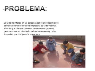 El documento habla sobre la falta de conocimiento que tienen las personas sobre el funcionamiento interno de las impresoras, a pesar de que son aparatos complejos con múltiples partes y procesos. Se propone como solución realizar explicaciones detalladas sobre cómo funcionan las impresoras para aumentar la comprensión de los usuarios sobre estos dispositivos.