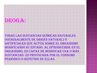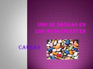 Este documento discute las causas del abuso de drogas en adolescentes, incluida la curiosidad, la necesidad de sentirse socialmente aceptados y la dificultad para manejar sentimientos fuertes. También describe los tipos de drogas, sus efectos y formas de prevenir el uso, así como los factores de riesgo y protectores. Finalmente, señala que los períodos de transición entre etapas del desarrollo son de alto riesgo para el consumo de sustancias.