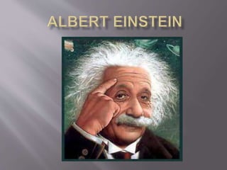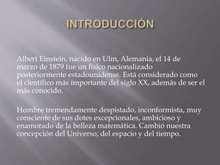 Este documento proporciona información sobre la vida y logros del físico Albert Einstein. Nació en Alemania en 1879 y se destacó como el científico más importante del siglo XX. Sus descubrimientos revolucionaron el entendimiento del universo y cambiaron conceptos como el espacio, tiempo y energía. Algunos de sus mayores contribuciones fueron la teoría de la relatividad, el efecto fotoeléctrico y la equivalencia entre masa y energía expresada en su famosa ecuación E=mc2.
