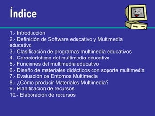 Este documento trata sobre el uso de herramientas multimedia en la educación. Explica conceptos como software educativo y multimedia educativo. Además, clasifica diferentes tipos de programas multimedia educativos y describe características, funciones y fases del diseño de materiales didácticos con soporte multimedia. Finalmente, ofrece recomendaciones sobre cómo producir este tipo de materiales y enumera diversas herramientas que se pueden utilizar.