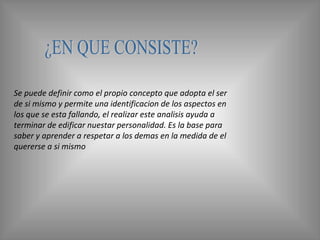 El documento habla sobre la autoestima. Define la autoestima como el concepto propio que una persona tiene de sí misma, lo que permite identificar áreas de mejora. La autoestima se forma a través del autoconocimiento, la autoaceptación y el autorrespeto. Incluye elementos cognitivos, afectivos y de conducta. También explica cómo fortalecer la autoestima a través del elogio, la valentía, la aceptación de debilidades y evitar comparaciones.