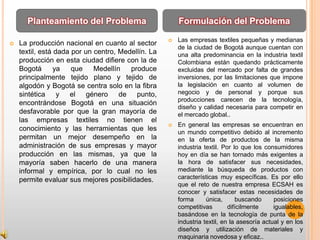 Este documento presenta la propuesta de creación de una planta de producción textil llamada Textiles Ecsah S.A. en Bogotá. En primer lugar, analiza la situación actual del sector textil en Colombia, donde la producción se concentra principalmente en Medellín. Luego, plantea como objetivo posicionar a Ecsah como una empresa líder en el mercado textil de Bogotá a través de estrategias de innovación tecnológica, satisfacción del cliente y mejora continua. Finalmente, detalla las fases de implementación de la empresa, que incluy