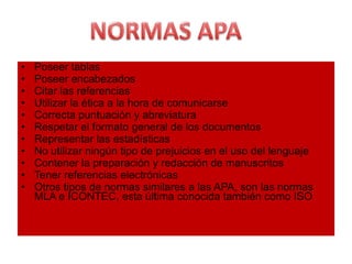 Las normas APA son un conjunto de normas establecidas por la American Psychological Association para la presentación de documentos académicos y científicos de manera uniforme. Estas normas incluyen la citación de referencias, el formato de tablas y encabezados, y una ética en la comunicación y el uso del lenguaje sin prejuicios. Las normas APA buscan promover la atribución correcta de ideas y la presentación consistente de la información.