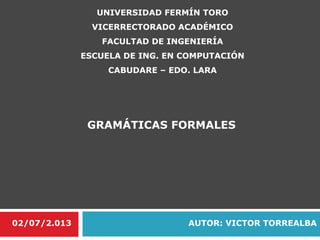 Este documento describe tres tipos de gramáticas formales. El Tipo 0 incluye lenguajes sin restricciones que están relacionados con problemas computables. El Tipo 1 describe lenguajes sensibles al contexto que son recursivos. El Tipo 2 incluye lenguajes sensibles al contexto y lenguajes independientes del contexto sin restricciones en el lado derecho de las reglas. También describe árboles de derivación que muestran gráficamente cómo derivar cadenas de un lenguaje a partir del símbolo distinguido de una gramática.