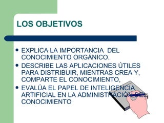 El documento describe los conceptos clave de la administración del conocimiento en las organizaciones. Explica cómo las organizaciones usan sistemas expertos y razonamiento basado en casos para capturar conocimientos especializados. También describe cómo la inteligencia artificial, incluyendo redes neuronales y lógica difusa, se usa para mejorar las bases de conocimiento y automatizar tareas.