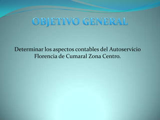 El documento describe los objetivos de investigar los aspectos contables de un autoservicio llamado Florencia en Cumaral. Los objetivos incluyen organizar un equipo de trabajo, definir la línea comercial, realizar análisis geográficos, entrevistar al propietario y contador, y establecer conclusiones sobre los aspectos contables manejados. El propósito es determinar cómo los manejos contables afectan el progreso del negocio.