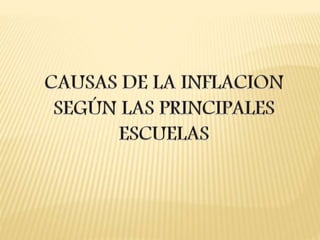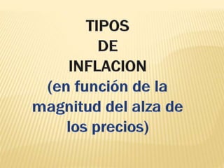 El documento define la inflación como el aumento sostenido y generalizado de los precios de bienes y servicios. Explica que la inflación puede ser causada por la emisión excesiva de dinero, déficit presupuestario o desequilibrio entre oferta y demanda. También describe los tipos de inflación (leve, alta e hiperinflación) y sus impactos económicos, como la redistribución de ingresos y efectos en la producción. Finalmente, analiza brevemente la experiencia de inflación en el Perú bajo el primer gobierno de Alan Garc