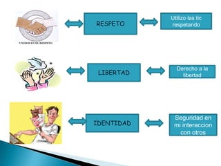 Este documento presenta información sobre el uso apropiado y responsable de las tecnologías de la información y la comunicación (TIC). Se describen principios como el respeto, la libertad, la identidad, la integridad y la privacidad al interactuar en línea. También destaca cómo las TIC pueden usarse para mejorar la calidad de vida y autonomía, y el deber de proteger a los menores.