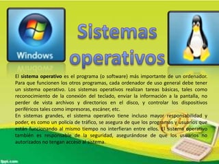 El documento habla sobre los sistemas operativos y los tipos de procesadores. Brevemente describe las características y diferencias entre sistemas operativos de software libre vs. propietarios, y entre procesadores AMD vs. Intel, incluyendo diferentes líneas como Core i7, Core i5, Core i3, dual core, Core 2 Duo y quad core.