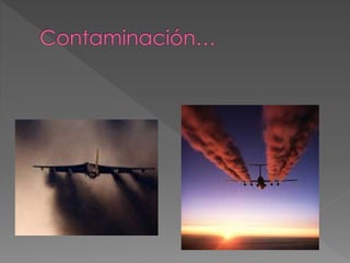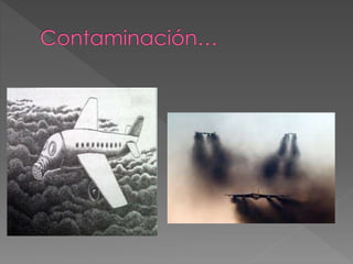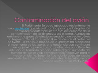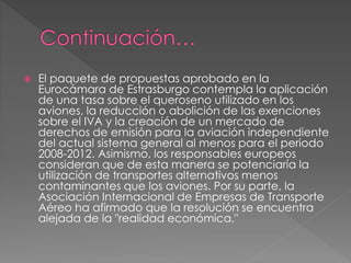 El documento discute varios esfuerzos para reducir las emisiones de la aviación y el transporte marítimo, incluyendo la imposición de tasas sobre el queroseno de aviones, el desarrollo de nuevas tecnologías más eficientes para aviones, y estudios sobre cómo reducir las estelas de los aviones. También estima que los barcos comerciales emiten casi la mitad de las emisiones de los automóviles y afectan la salud en zonas costeras, y describe estudios sobre las emisiones de varios barcos. Finalmente