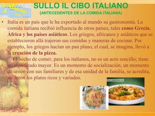 El documento presenta información sobre la gastronomía italiana, incluyendo los antecedentes históricos que influyeron en su desarrollo. También describe el montaje de una mesa italiana, reglas para la preparación de alimentos, menús típicos con platillos como lasagna, cuete y tiramisú, e ingredientes y preparación de dichos platillos.