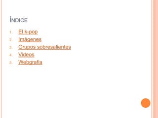 Este documento presenta información sobre la cultura del K-pop de Corea del Sur. Explica que el K-pop ha influido la música y moda a nivel mundial. También describe varios grupos musicales populares de K-pop como Super Junior, Big Bang, 2PM y Girls Generation. Incluye biografías e imágenes de artistas de K-pop prominentes como Kim Bum, Choi Siwon y CL. Finalmente, proporciona enlaces a videos musicales de K-pop y sitios web con más detalles sobre los artistas.
