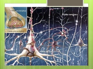 El documento describe la neurona, la unidad funcional del sistema nervioso. Las neuronas se comunican entre sí a través de sinapsis para transmitir impulsos nerviosos. Están formadas por dendritas para recibir estímulos, un cuerpo celular con núcleo, y un axón para transmitir los estímulos a otras células. Existen diferentes tipos de neuronas clasificadas según la morfología de sus prolongaciones, como las monopolares, bipolares y multipolares.