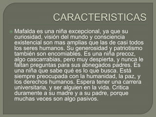 Mafalda es una niña precoz de 6 años cuya curiosidad y visión del mundo son más amplias que la mayoría de los adultos. Le gustan la paz, los derechos humanos y la democracia, mientras que odia la injusticia, la guerra y el racismo. Vive en Buenos Aires, Argentina con sus padres y hermano menor en una familia de clase media.