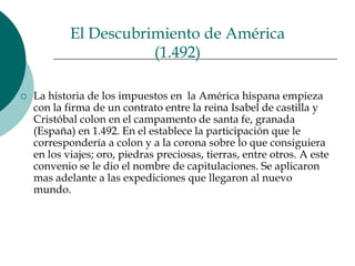 Las capitulaciones firmadas entre la corona española y Cristóbal Colón establecieron los impuestos sobre los bienes obtenidos en América. Durante la colonia, los gobernadores recaudaban impuestos como la encomienda, la mita y el diezmo para la corona. La revolución de los comuneros en 1781 se opuso a los aumentos de impuestos, siendo sus líderes capturados y ejecutados. A lo largo de la historia colombiana, los diferentes gobernantes han creado, modificado y recaudado diversos imp