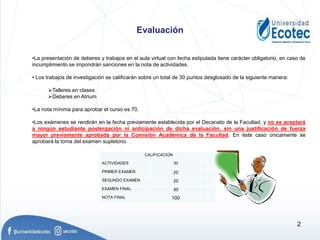 Este documento presenta información sobre las matemáticas financieras. Explica los conceptos de evaluación, interés simple, interés compuesto, descuento simple y capitalización. También incluye fórmulas y ejemplos para calcular intereses, descuentos, valores presentes y futuros.
