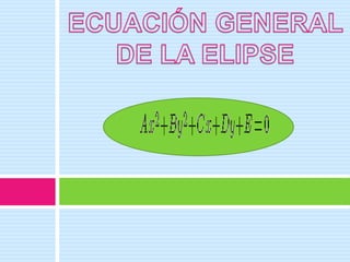 Este documento describe las características de una elipse. Define una elipse como el conjunto de puntos cuya suma de distancias a dos puntos fijos, llamados focos, es constante. Explica los elementos de una elipse como el eje principal, vértices, ejes mayor y menor, centro y lado recto. Luego presenta ejemplos de ecuaciones de elipses y resuelve problemas relacionados con encontrar los elementos de una elipse dada su ecuación.