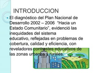 El documento describe un programa de aceleración de aprendizaje en Colombia para niños y jóvenes que se encuentran en extra-edad en la educación básica primaria. El programa ofrece una metodología de aprendizaje flexible a través de siete módulos y materiales educativos para ayudar a los estudiantes a completar los logros de los primeros cinco grados en aproximadamente un año y medio. El objetivo es resolver el problema de desfase entre la edad y el grado para mejorar el desarrollo de competencias básicas