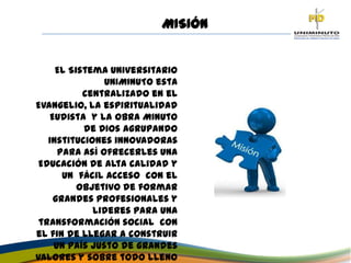 El documento describe la misión y visión de UNIMINUTO de ofrecer una educación de alta calidad con acceso fácil para formar líderes que transformen la sociedad. También presenta los derechos, deberes y reglas para estudiantes, incluyendo que se pierde una asignatura si se falta al 15% o más de las clases sin justificación o al 25% con justificación. Finalmente, detalla los pasos para cambiar la contraseña en el sistema de información Genesis.