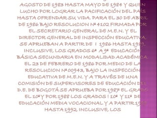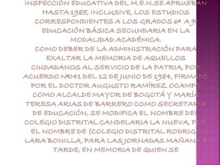 El documento describe la creación del Colegio Distrital Candelaria La Nueva en Bogotá en 1983 mediante un acuerdo firmado por el alcalde y la secretaria de educación. Se asignó una planta física para el funcionamiento del nuevo colegio.